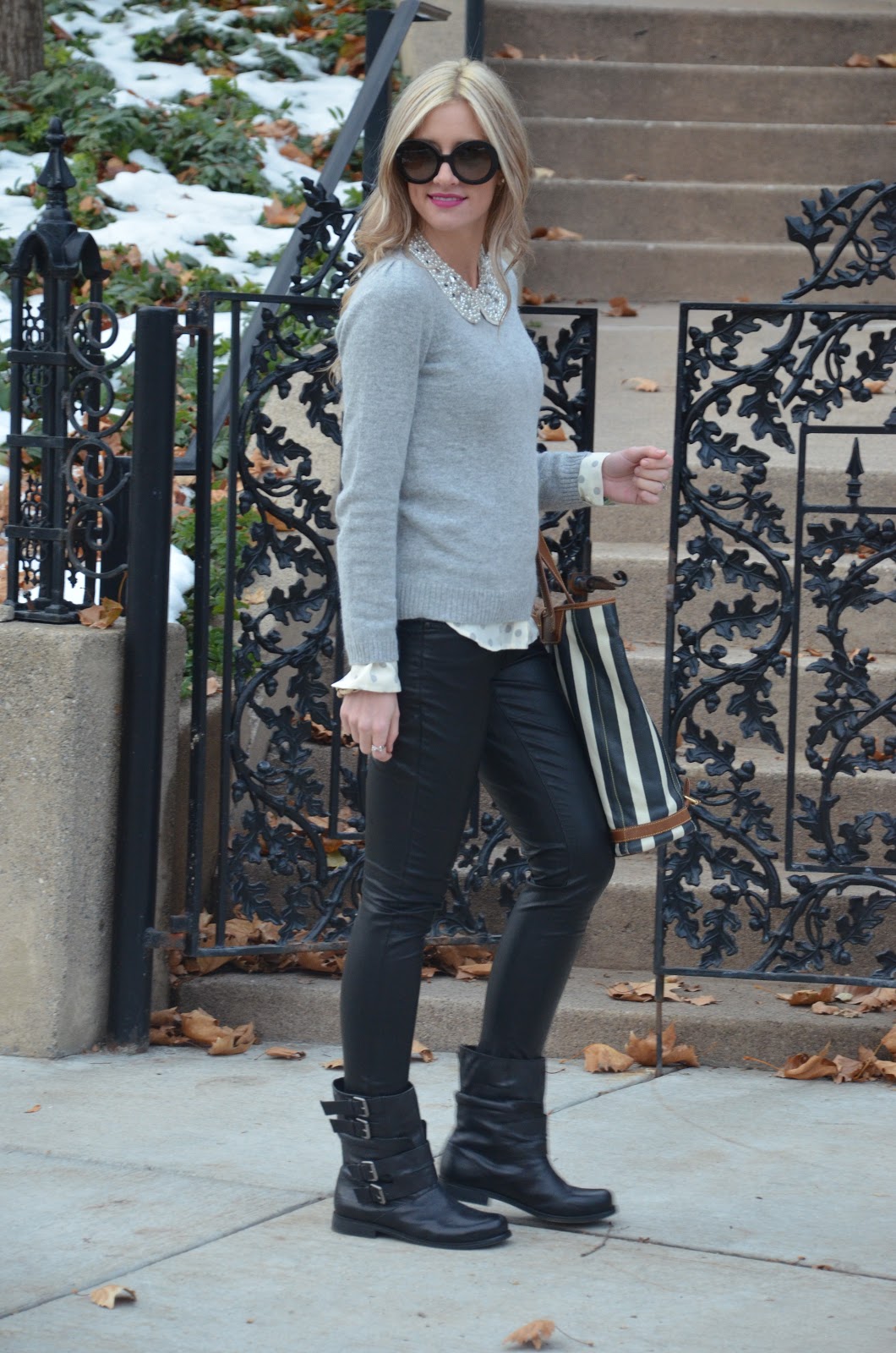 love the mix or leather with teh soft swater and girly embellished collar.