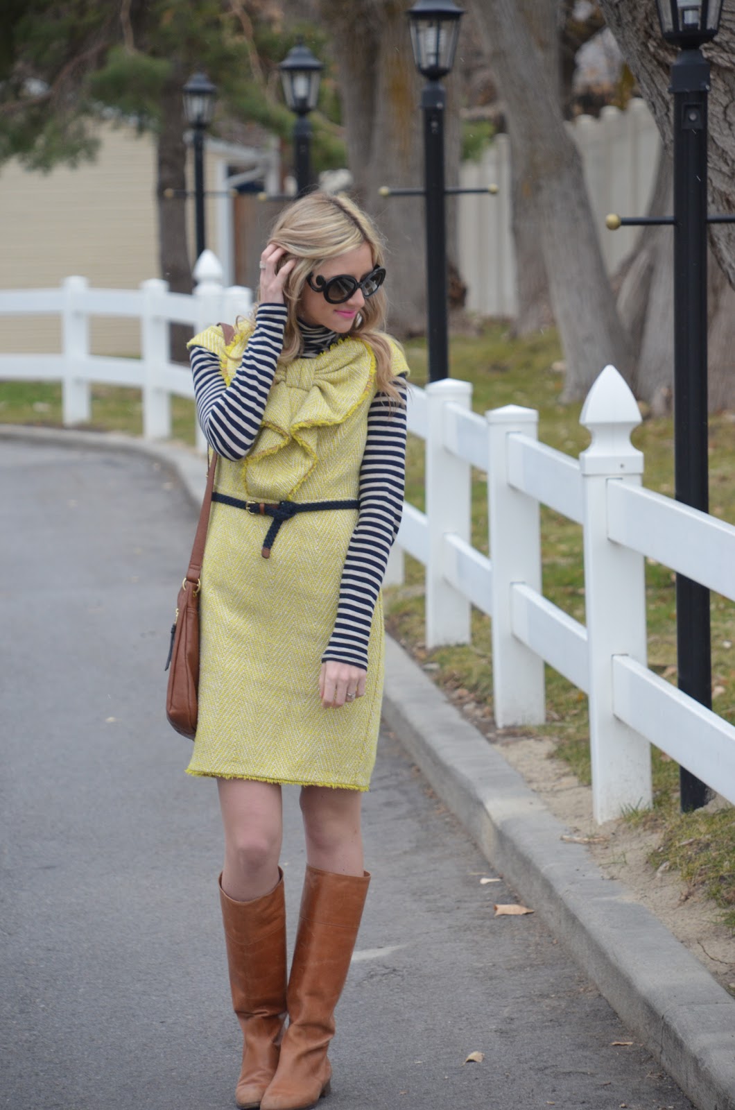 Top: J.Crew | Dress: Eva Franco via Anthropolgie {old} | Belt: J.Crew | Boots: J.Crew | Sunglasses: Prada |