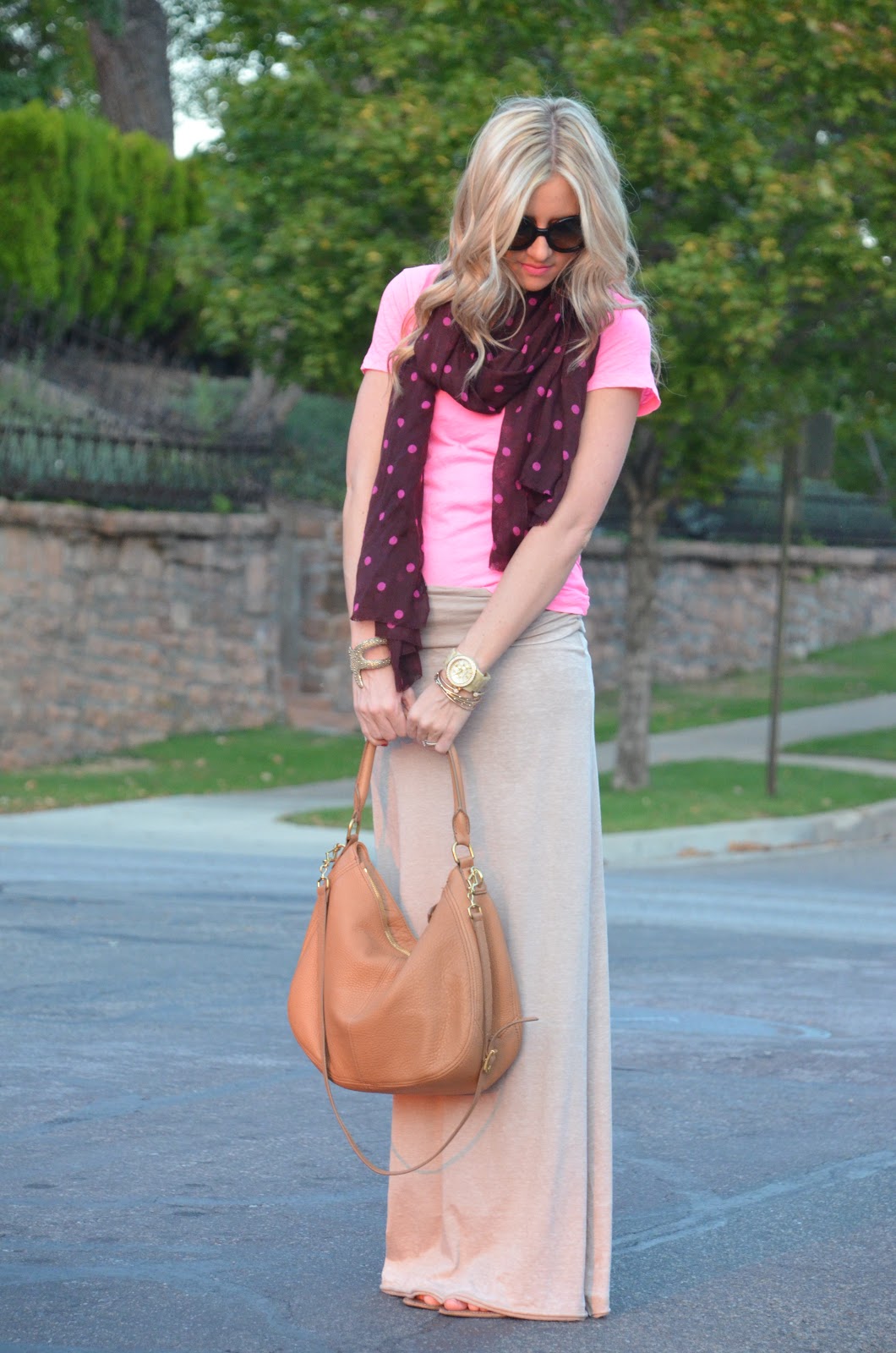 Love the maxi skirt for fall! The polka dot scarf is the perfect touch.